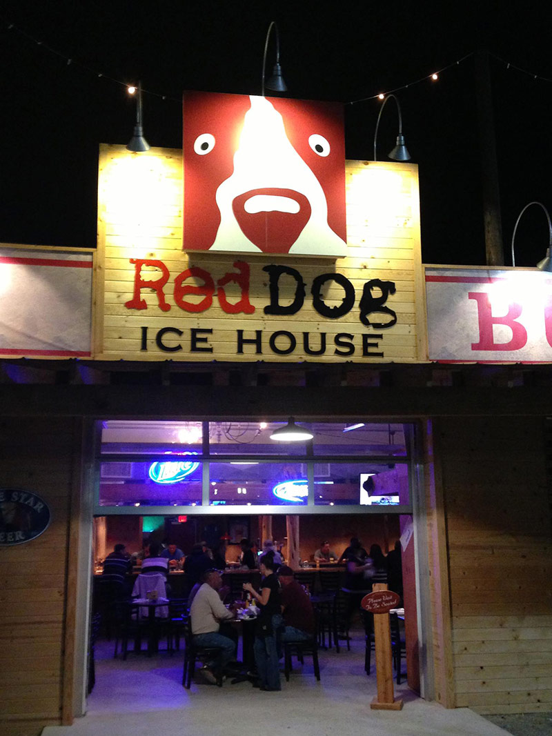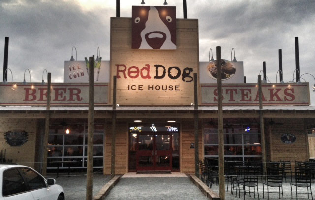 Red Dog Ice House offers the comfort and relaxed environment of a modern open-air ice house complete with a 40-foot bar, an array of flat screen TVs, and table seating for up to 120 guests. Red Dog is stocked with familiar ice house staples including longneck beers, pitcher margaritas, steaks, burgers, baked potatoes and even fried pickles.